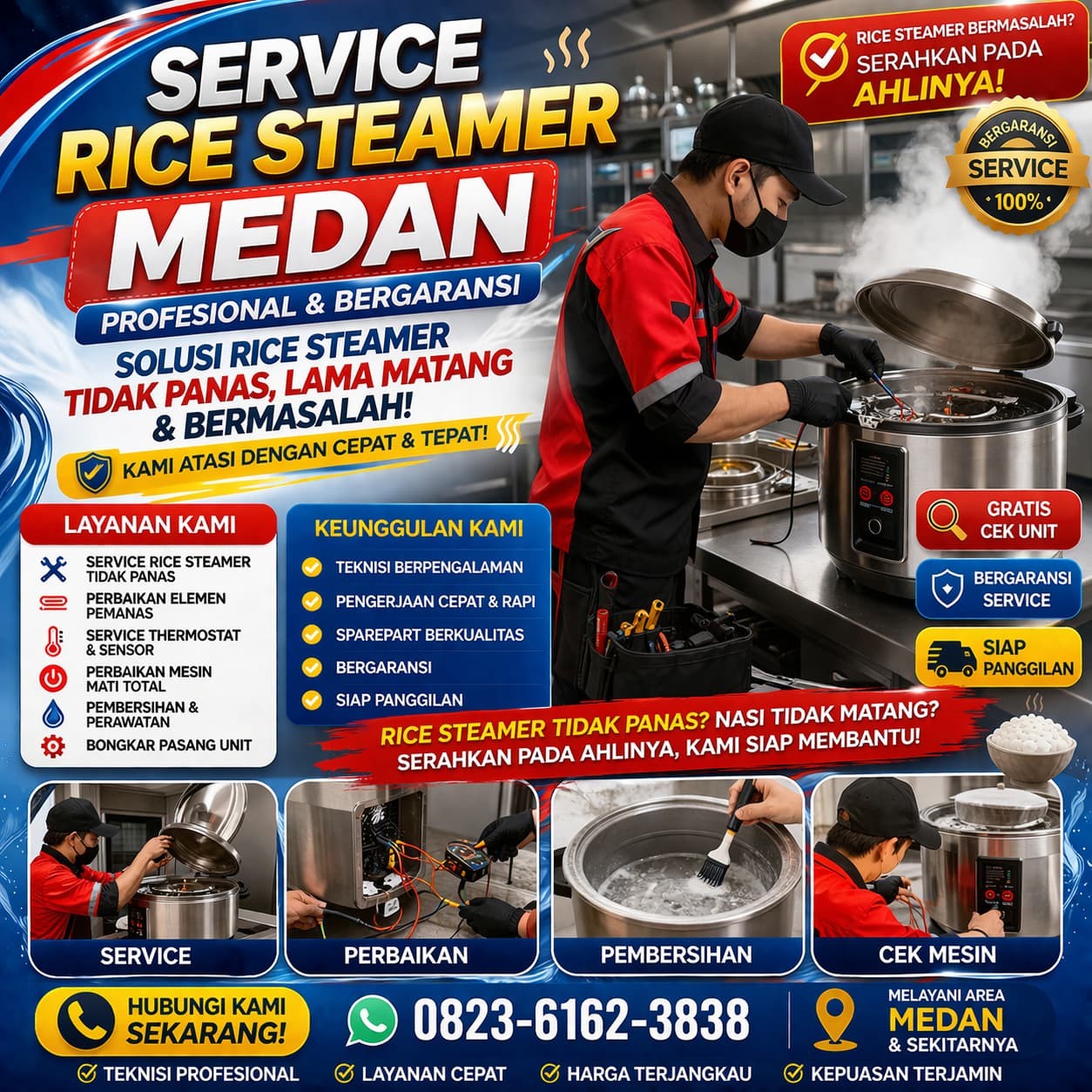 - Teknisi Berpengalaman – Lebih dari 10 tahun menangani rice steamer semua merk.