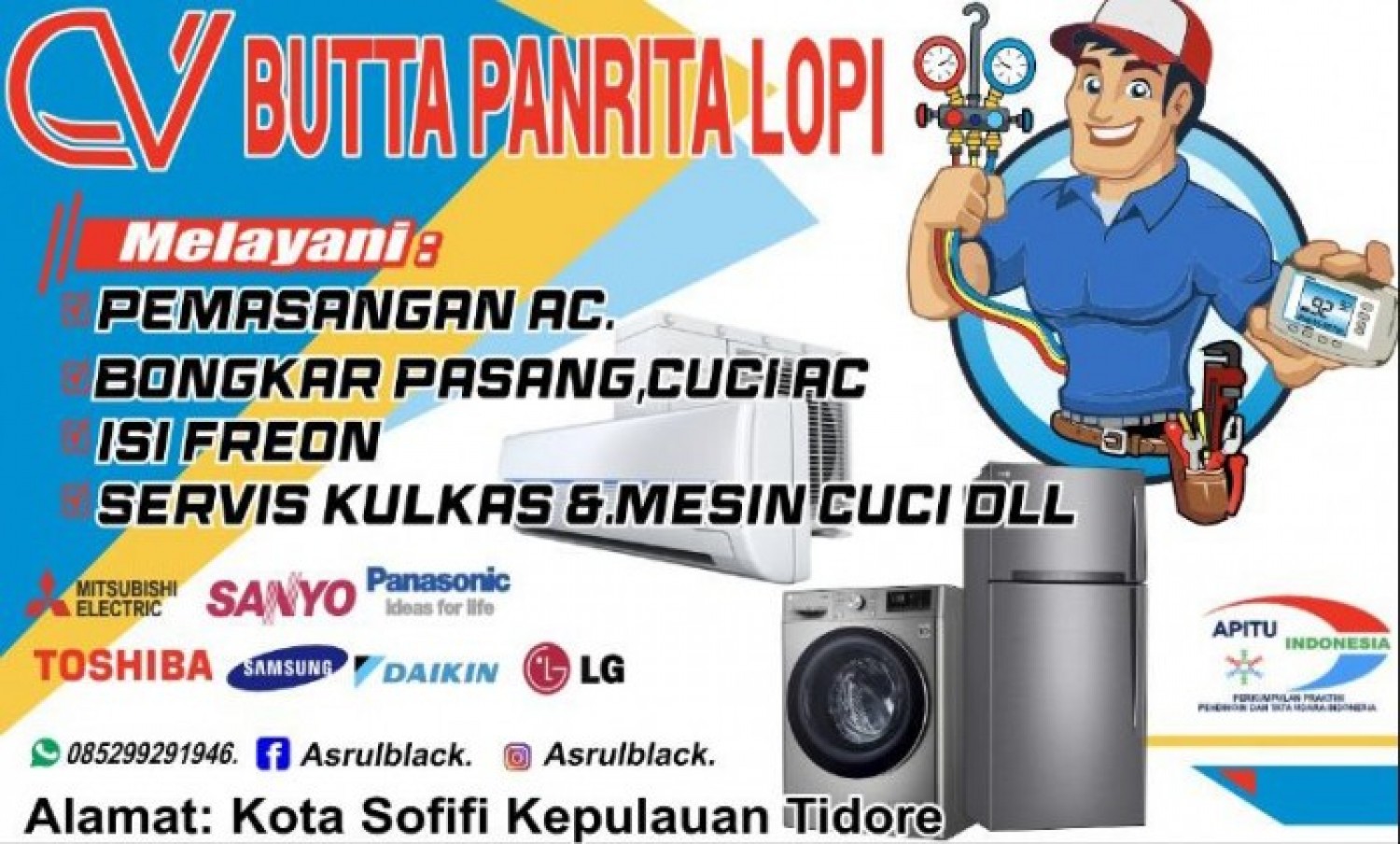 Service AC Tidore CV Butta Panrita Lopi 085299291946 Melayani Berbagai Jenis Pekerjaan Bidang Jasa Pendingin AC Seperti Cuci AC Pasang AC Bongkar Pasang AC Perbaikan AC Isi Freon AC Tambah Freon AC.Service AC Tidore CV Butta Panrita Lopi Melayani Service AC LG,Service AC Panasonic,Service AC Samsung,Service AC Daikin,Service AC Sharp,Service AC Changhong,Service AC Mitsubishi,Service AC Gree,Service AC Toshiba,Service AC Sanyo,Service AC Midea,Service AC Aqua,Service AC Cawang Dan Merk2 AC Lainnya